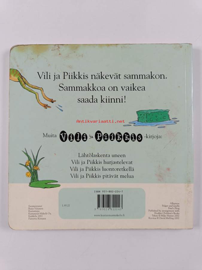 Muu(t) tekijä(t): Raija Viitanen, David MellingAlkuteos: FIDGET AND QUILLY FIND A FROGAsiasanat: lastenkirjallisuus, siilit, pesukarhut, kuvakirjat, paksulehtiset kirjat