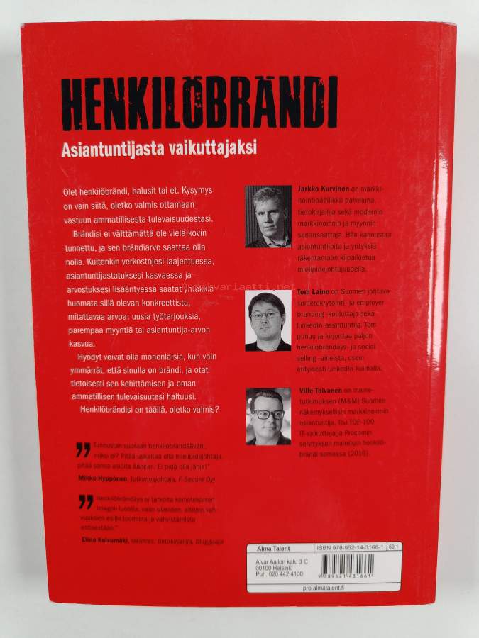 Muu(t) tekijä(t): Ville Tolvanen, Tom LaineAsiasanat: markkinointi, sosiaalinen media, viestintä, imago, osaaminen, vaikuttavuus, asiantuntijuus, verkostoituminen, asiantuntijat, brändäys, professionalismi, näkyvyys, hyödyntäminen, henkilöbrändäys
