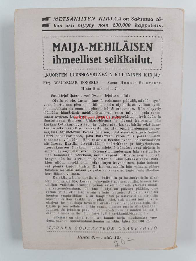 Tyydyttävä. Tarkempi kuntoluokka: K2+ ; Pienoista repeämää reunoilla, hieman kulumaa, pienoista taitejälkeä kansissa, kansien reunoilla taittumaa ja rispaantumaa (koska ohuehkot kannet sivuja leveämmät), selkämyksessä lukutaittumaa, sivut vielä osittain leikkaamatta auki eli osittain lukematon kirja