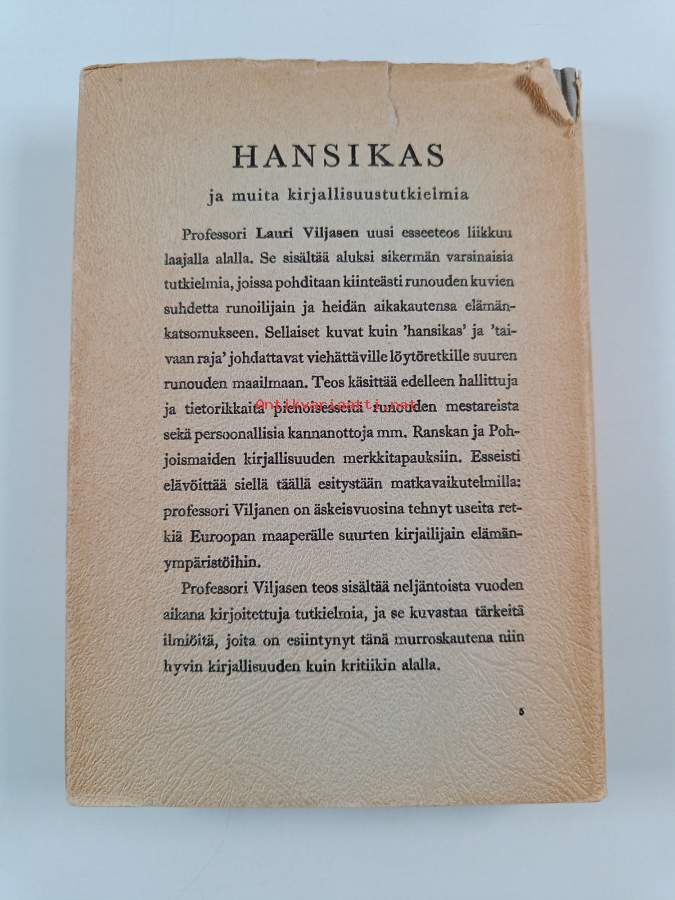 Hansikas ja muita kirjallisuustutkielmiaKirjaHenkilö Viljanen, Lauri, 1900-1984WSOY 1955.