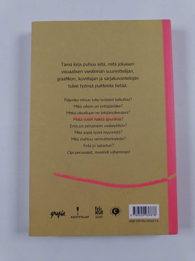 Muu(t) tekijä(t): Juliana HyrriAsiasanat: kuvittajat, yritystoiminta, tekijänoikeus, verotus, yrittäjyys, graafikot, yrittäjät, sopimukset, palkkiot, sosiaaliturva, visuaalinen viestintä, freelance-työntekijät, visuaalinen suunnittelu, sarjakuvataiteilijat, graafiset suunnittelijat, laskutus