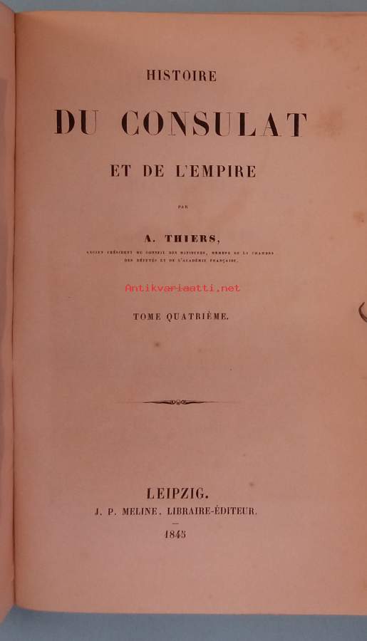 Histoire du Consulat et de l’Empire on Adolphe Thiersin laaja 20‑osainen historiateos, joka käsittelee Ranskan konsulaatin ja Napoleonin imperiumin aikaa. Teosta julkaistiin 1845–1862, ja se oli aikanaan erittäin vaikutusvaltainen historiankirjoitus. Vuoden 1845 Leipzigissä J. P. Mélinen kustantama painos on teoksen alkuperäisiä varhaispainoksia. Teräspiirokset: Joachim Murat – Roi de Naples ja Marsalkka Soult – “Le Mal Soult”Kirjassa oleva Ex Libris Walter Ahlqvist on tyylikäs ja taiteilija L. Sparren signeeraama. ( taiteilijan signeeraus L. Sparre VII eli kreivi Louis Sparre, suomalaisen taidegrafiikan pioneeri )Koristeellinen nahkaselkä.