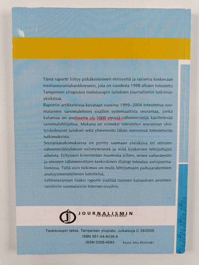 Muu(t) tekijä(t): Pentti RaittilaSarja: Julkaisuja / Tampereen yliopisto, tiedotusopin laitos. Sarja C 39Asiasanat: Internet, journalismi, joukkoviestintä, lehdistö, sanomalehdet, joukkoviestimet, media, rotusyrjintä, rasismi, dialogisuus, etnisyys