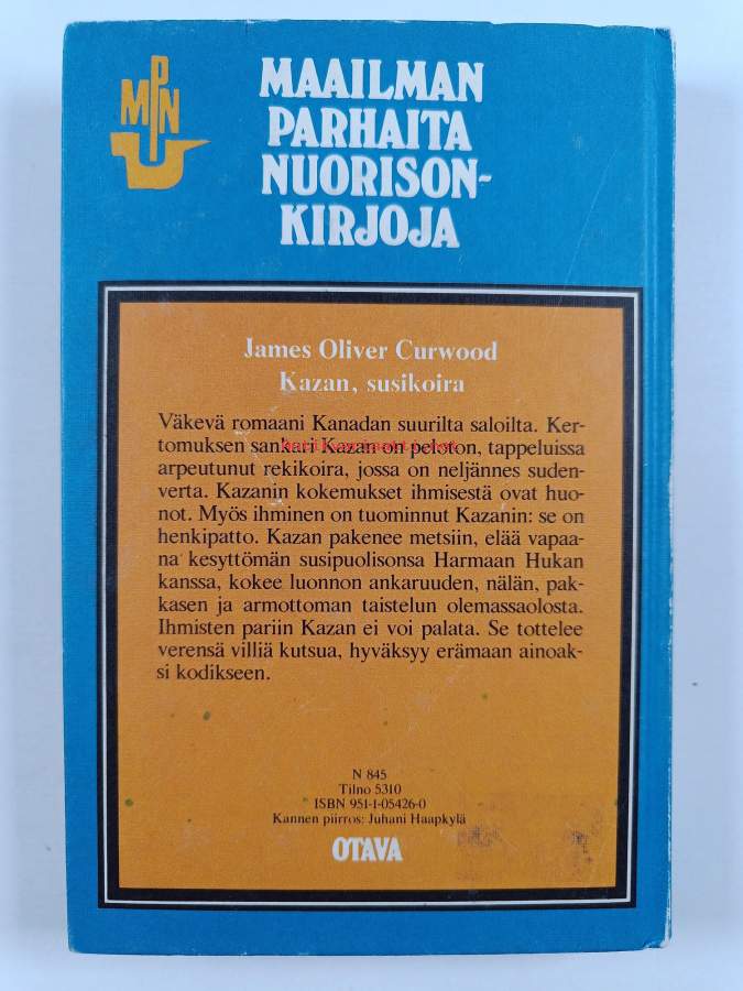 Kazan susikoira : seikkailukirja suurilta saloseuduiltaKazanKirjaCurwood, James Oliver ; Henkilö Tervaskanto, JussiOtava 1957.