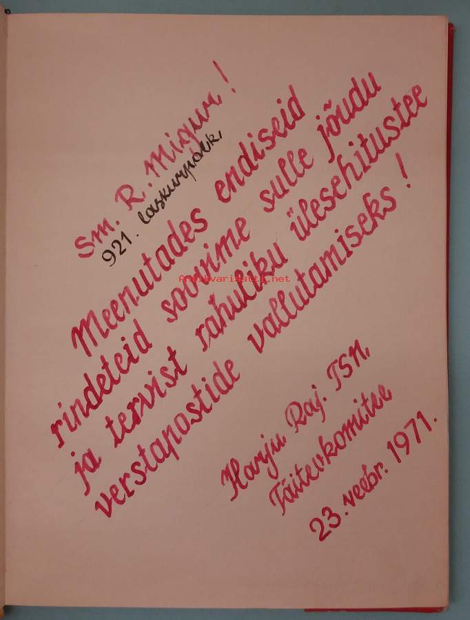 Teos kuvaa Viron alueelta kotoisin olleiden sotilaiden vaiheita toisen maailmansodan aikana, taisteluita sekä yksikköjen liikkeitä ja veteraanien muistoja. Dimensiot 30 ¤ 23 cm. Mukana vihkonen, jossa kuvien selitykset englanniksi ja venäjäksi.Etusivun omiste suomeksi:Toveri R. Miigur! 921. jalkaväkirykmenttiMuistellessamme entisiä rintamateitä toivotamme sinulle voimaa ja terveyttä rauhallisen jälleenrakennustien virstanpylväiden saavuttamiseen!Harjun piirin kansanedustajain neuvoston täytäntöönpaneva komitea23. helmikuuta 1971."**