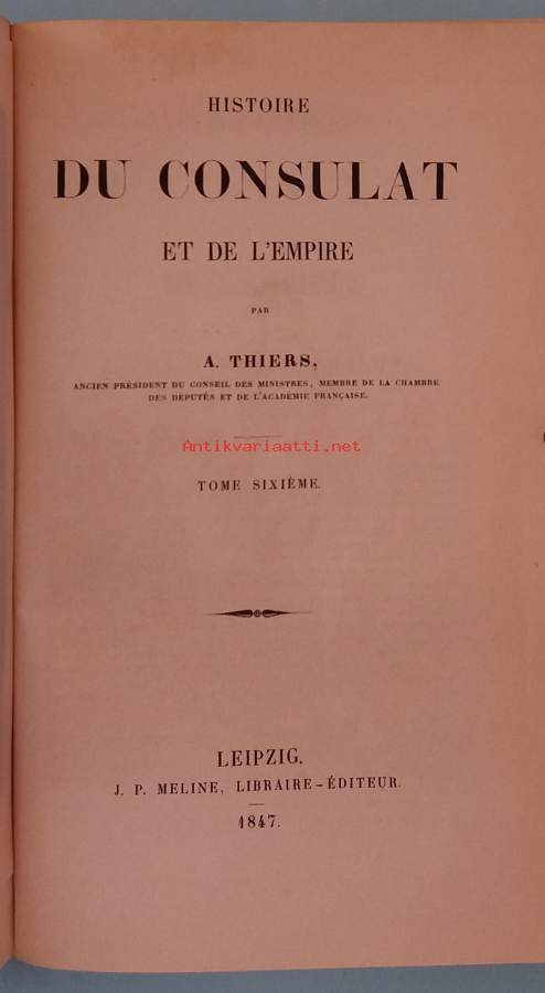 Histoire du Consulat et de l’Empire on Adolphe Thiersin laaja 20‑osainen historiateos, joka käsittelee Ranskan konsulaatin ja Napoleonin imperiumin aikaa. Teosta julkaistiin 1845–1862, ja se oli aikanaan erittäin vaikutusvaltainen historiankirjoitus. Vuoden 1845 ja 1847 Leipzigissä J. P. Mélinen kustantama painos on teoksen alkuperäisiä varhaispainoksia. Teräspiiros: Alexandre Ier – Empereur de Russie + Napoleon Bonapartea ratsain.Kirjassa oleva Ex Libris Walter Ahlqvist on tyylikäs ja taiteilija L. Sparren signeeraama. ( taiteilijan signeeraus L. Sparre VII eli kreivi Louis Sparre, suomalaisen taidegrafiikan pioneeri )Koristeellinen nahkaselkä.