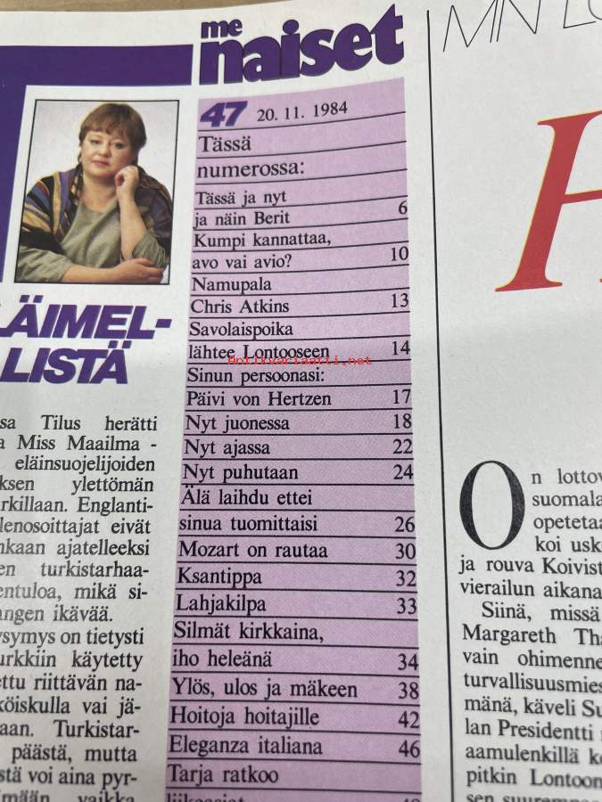 Me Naiset 1984 nro 47 (20.11.), Koivistot Englannissa, Berit, Lasse Lehtinen, Sinun persoona Päivi von Hertzen