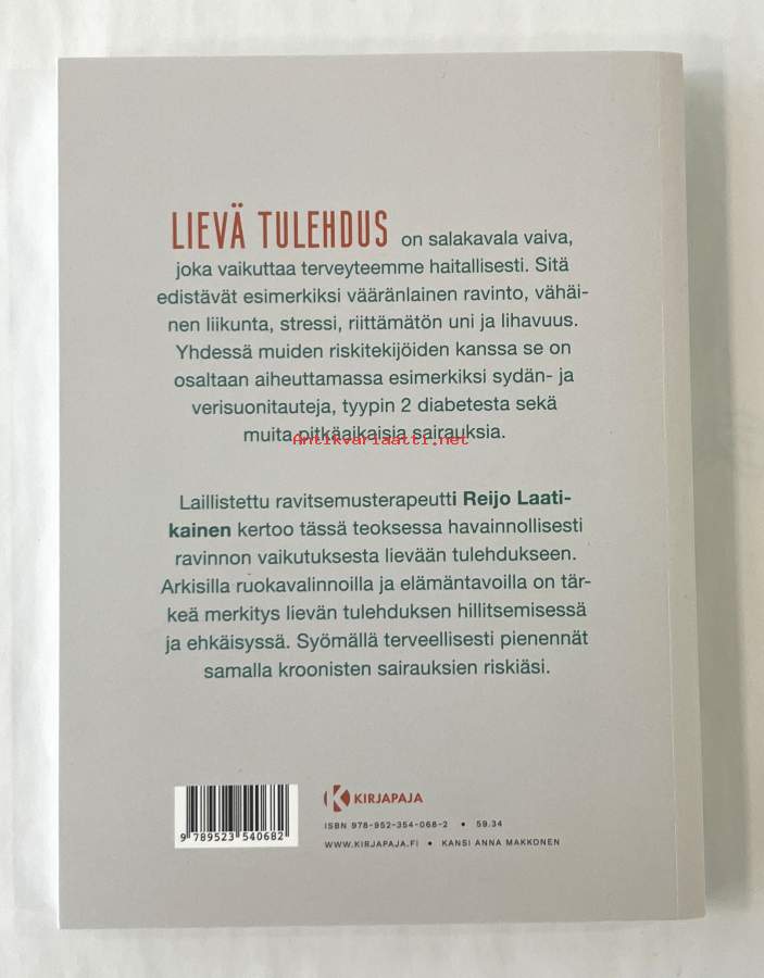 Ravitsemusterapeutti Reijo Laatikainen kertoo teoksessa ravinnon vaikutuksesta lievään tulehdukseen. Syömällä terveellisesti pienennät samalla kroonisten sairauksien riskiäsi.