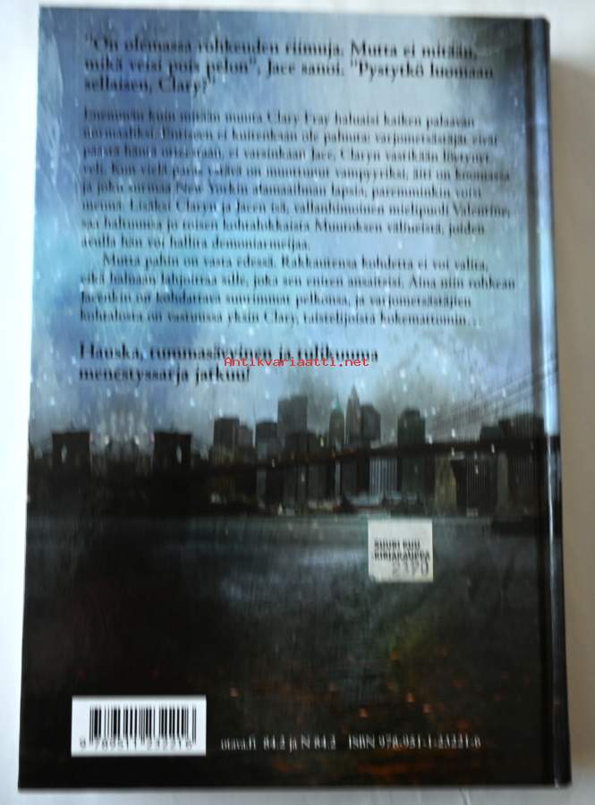 Hauska, tummasävyinen ja seksikäs fantasiatrilogia jatkuu Enemmän kuin mitään muuta Clary Fray haluaisi kaiken palaavan normaaliksi - ehkä seurustelu Simonin kanssa auttaisi? Mutta Varjometsästäjät eivät päästä häntä otteestaan - varsinkaan heistä hurmaavin ja raivostuttavin, Claryn vasta löytynyt veli Jace. Lisäksi syyllinen Claryn äidin maagiseen koomaan on vaarallinen mielipuoli Valentine, joka lienee Claryn isä. Paremminkin voisi mennä! Sitten joku alkaa surmata New Yorkin haltioita, ihmissusia ja vampyyreja. Lisäksi jo toinen Muutoksen välineistä, Kohtalon miekka, katoaa. Pystyykö Clary estämään pahimman varjojen maailmassa, jossa rakkauteen ei voi luottaa ja jossa valta on vaarallisen viettelevää?