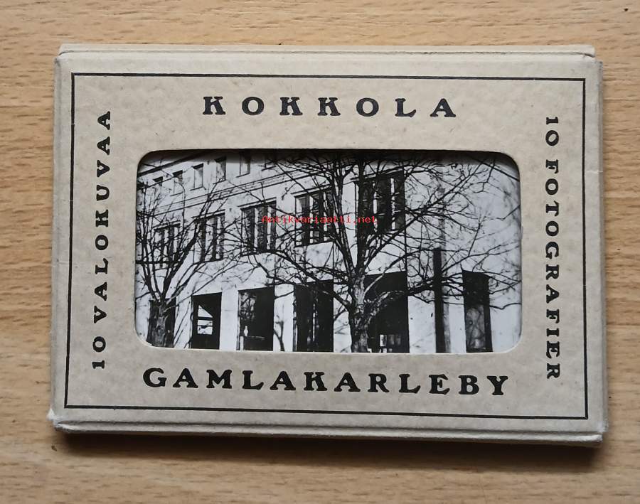 10 mustavalkoista pientä kuvaa pahvikansiossa ja kuvaluettelo. 9,5x7 senttiä.