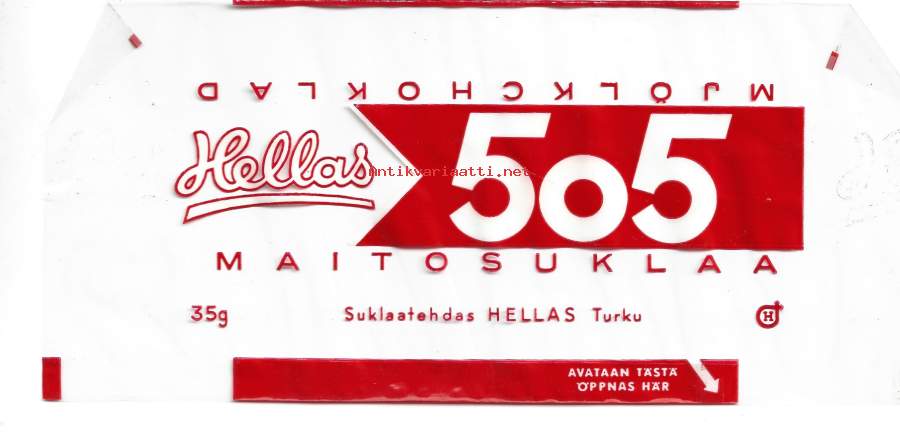 Hellas 505 Maitosuklaa - suklaakääre makeiskääre, makeiskääre 9x20 cm vuodelta 1955 / Oy Hellas Ab oli suomalainen makeisalan yritys, Turussa. Hellaksen
