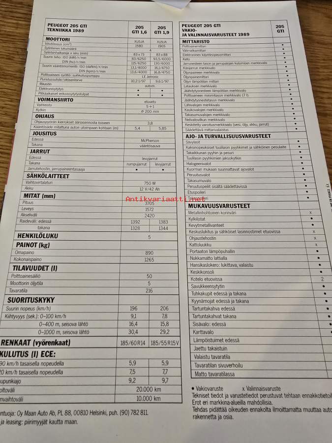 Peugeot 205 GTI myyntiesite 1989