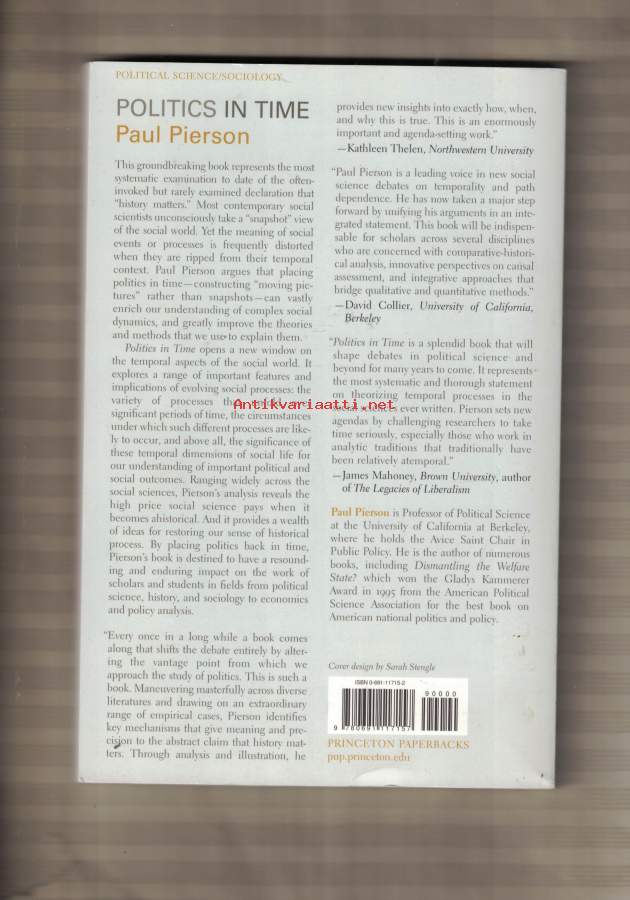 This groundbreaking book represents the most systematic examination to date of the often-invoked but rarely examined declaration that “history matters.” Most contemporary social scientists unconsciously take a “snapshot” view of the social world. Yet the meaning of social events or processes is frequently distorted when they are ripped from their temporal context. Paul Pierson argues that placing politics in time—constructing “moving pictures” rather than snapshots—can vastly enrich our understanding of complex social dynamics, and greatly improve the theories and methods that we use to explain them.Politics in Time opens a new window on the temporal aspects of the social world. It explores a range of important features and implications of evolving social processes: the variety of processes that unfold over significant periods of time, the circumstances under which such different processes are likely to occur, and above all, the significance of these temporal dimensions of social life for our understanding of important political and social outcomes. Ranging widely across the social sciences, Pierson’s analysis reveals the high price social science pays when it becomes ahistorical. And it provides a wealth of ideas for restoring our sense of historical process.- Suuri Helposti kuori