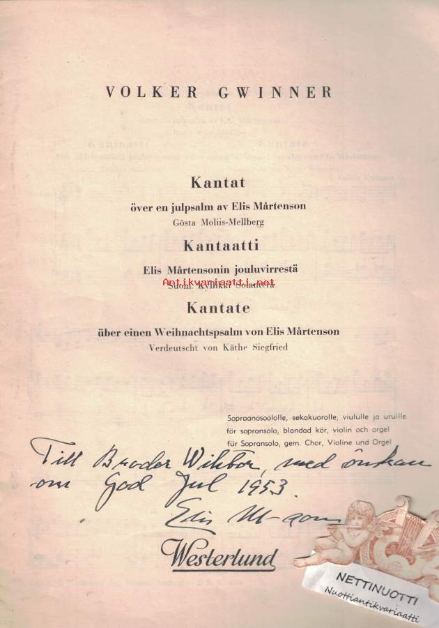 Kantaatti Elis Mårtensonin jouluvirrestä - Kantat - Kantate.Sopraanosoololle, sekakuorolle, viululle ja uruille.