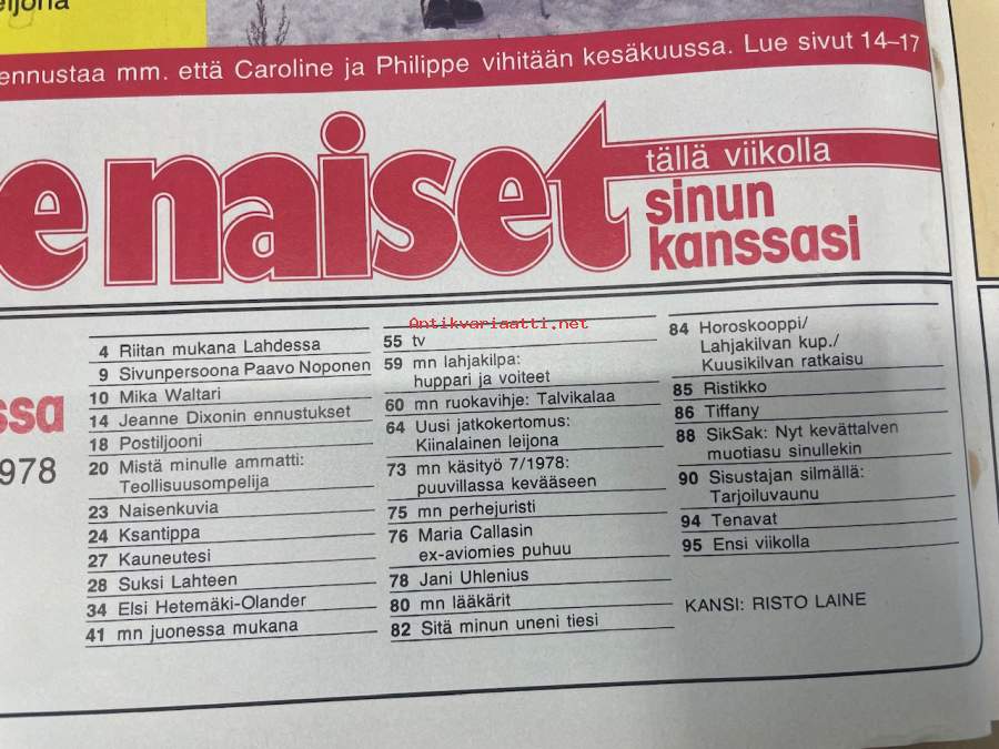 Me Naiset 1978 nr 7 (16.2.), Riitta Väisäsen kanssa Lahdessa, sivun persoona Paavo Noronen, Mika Waltari, Liisa Pekkala, Seija Paakkola Miss Suomi