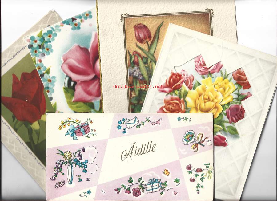 Äitienpäiväkortti erä 1940-60 luvuilta 5 kpl erä - äitienpäiväkortti, onnittelukortti, taittokortti, postikortti