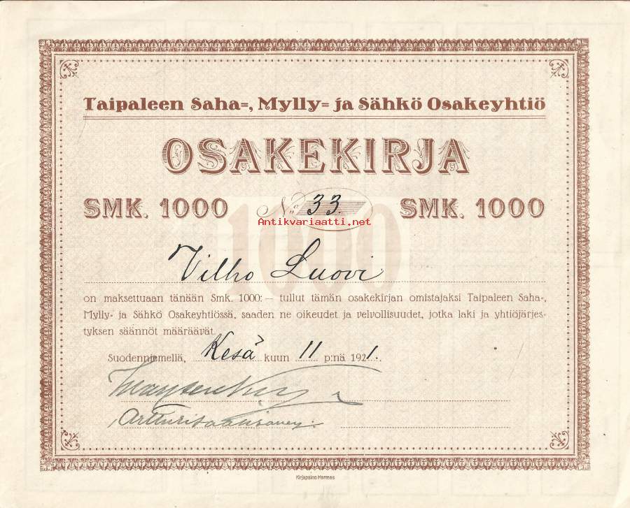 Taipaleen Saha-, Mylly- ja Sähköosakeyhtiö, Taipale, Suodenniemi 1921, 1 000 mk, nr 65 Paavo Rauvala -osakekirja / share certificate