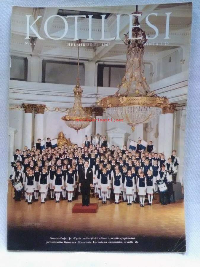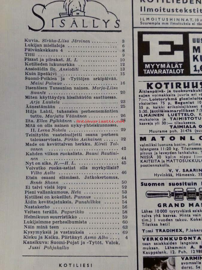 Ilmestynyt 19.2.1966,76s., sisällysluettelo kuvassa,sisällys mm. Titti, Pizzat ja piirakat, Ansioäidin ilo, Kuin lipeäkivi, Suomi-Poikien ja -Tyttöjen arkipäivää, Itsenäisen Tansanian nainen, Miten käyttäydyn hissihäiriön sattuessa, Äänestämään, Hilja Lahti, tuhansien perheenemäntien tuttu, Ilta, Mitä on olla nainen nyky-yhteiskunnassa, Teinitytön vaalibudjetti osana perheen talousarviosta, Made on kevättalven herkku, Kahden viikon ruokalista, Nyt on aika, Voivatko ruoka-astiat olla myrkyllisiä?, Etsin osaani elämässä jatkokertomus, Ei talvi vielä lopu, Pieni vallankumous, Kotiliesi on kokeillut, Äidin kevätajatuksia, Veitsen terällä, Näin minä teen