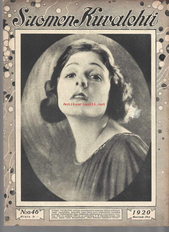 Suomen Kuvalehti 1920 nr 46, kansikuva Norma Talmadge, Viron maaseudulta, Suomalainen "Mystery man" Lontoossa, Päivänkuvia ulkomailta, ym.