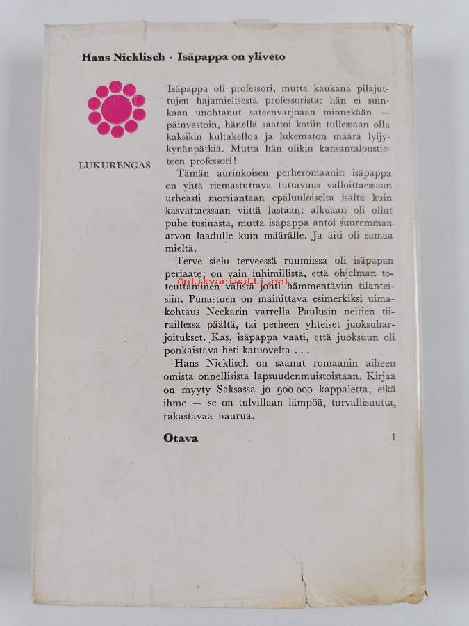 Hyvä. Tarkempi kuntoluokka: K3- ; Hieman kolhua kansissa, hieman kulumaa, selkämyksessä hieman vinoutta. Kansipaperin kunto: kulumaa/pienehköjä repeämiä & tahraisuutta
