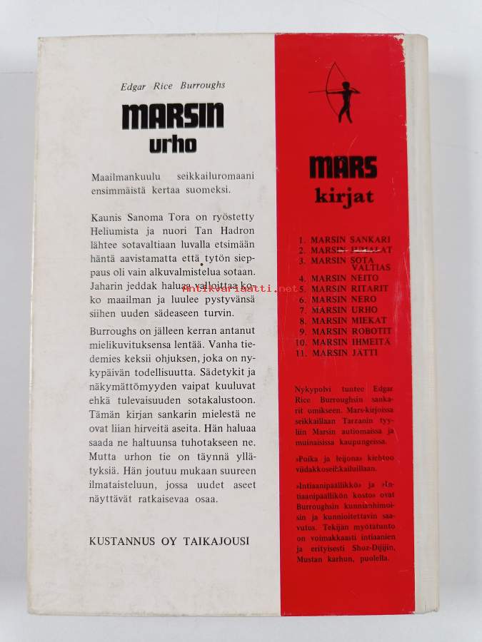 Muu(t) tekijä(t): Seppo IlmariSarja: Mars-sarja 7Alkuteos: A fighting man of MarsAsiasanat: nuoret, taistelut, keksinnöt, avaruus, ihmisryöstöt, ilmasota, tieteiskirjallisuus, aseet, seikkailu, Mars, sarjakertomukset, avaruuskirjat