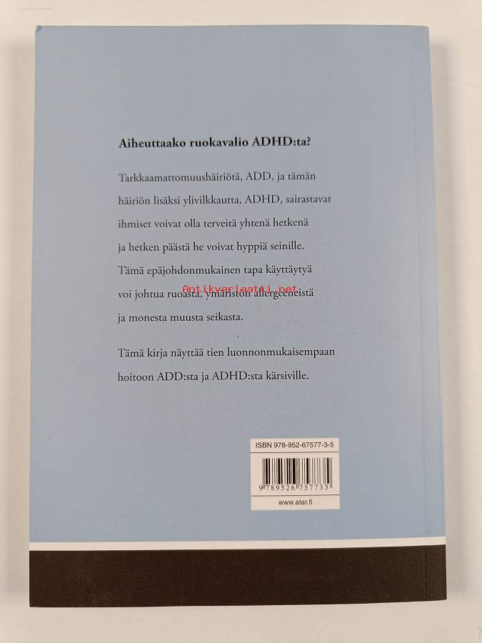Muu(t) tekijä(t): Kari Koski, Rachel BellAlkuteos: The A.D.D. & A.D.H.D. diet!Asiasanat: ruokaohjeet, ruoka-aineet, ravitsemuskäyttäytyminen, hoitomenetelmät, ruokavaliot, muutos, luontaishoito, ravintoainevalmisteet, häiriöt, tarkkaavaisuus, ADHD, luonnonmukaisuus