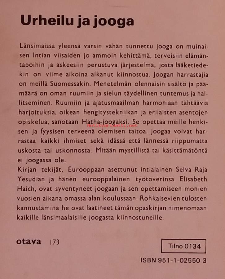 Sisällöstä mm: Joogan vaikutusta voimaan, notkeuteen ja keskittymiseen, Mielen ja kehon yhteyttä urheilusuorituksissa, Henkistä kasvua ja itsekuria, jotka tukevat fyysistä harjoittelua jne. Dimensiot 19 ¤ 13 cm. Kuvitettu.
