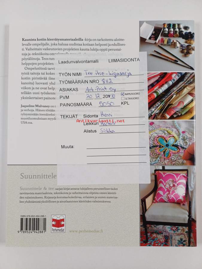 Muu(t) tekijä(t): Nina ValjakkaSarja: Suunnittele & teeAsiasanat: käsityöohjeet, huonekalut, ompelu, kierrätysmateriaalit, ompelutyöt, verhot, uusiotuotteet, pöytäliinat