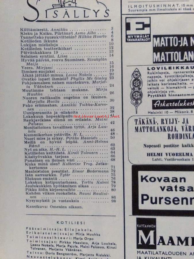 Ilmestynyt 8.10.1966,104s., sisällysluettelo kuvassa,sisällys mm. Kiittämisestä,Tunnetteko ruusukvittenin?,Kotilieden ikkuna,Lukijan mielialoja,Kotilieden teatterikiikari,Päivänkakkara 19,Salainen syntini,Hyvää päivää, rouva Suominen,Veera,Ihmisen suojaksi,Älkää jättäkö minuaOvatko lapset ihmisiä?,Pohjoismaisen naisen muotokuva,Muutimme tehtaan mukana,Nuoren radikaalin ongelma on ikuinen,Pako erämaahan,Uuniperunoita ja -silakoita,Reykjavikissa elämä on erilaista,Monitaitoinen tavallinen tyttö,Nuori mies ja syksy,Meillä on hyvää leipää,Kotilieden keittiöstä,Käsityövakka tarjoaa,Punainen on iloinen väri,jatkokertomus: Kuka minä olen?,Maalaistalon pesutilat,Isän aarrearkku,Elokuun emäntä,Lokakuu kotipuutarhassa,Joulukukkien hyödyntämisen aika,Kahden viikon ruokalista