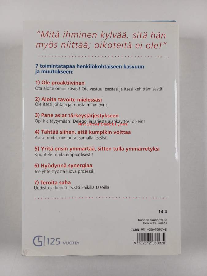 Muu(t) tekijä(t): Raimo SalminenAlkuteos: The 7 habits of highly effective peopleAsiasanat: elämäntaito, menestyminen, ihmissuhteet, sosiaaliset taidot