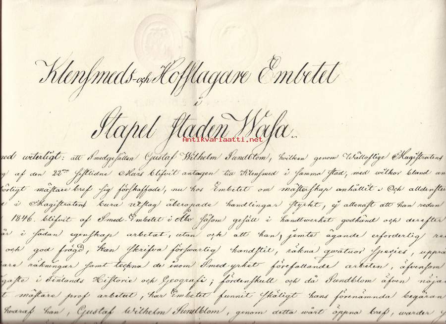 Klenmeds- och Hofflagare Embetet i Stapel staden Wasa -käsityöläiskillan myöntämä mestarikirja.Asiakirja on päivätty 1800-luvulle ja todistaa Gustaf Wilhelm Sundblomin tulleen hyväksytyksi mestariksi Vaasan kaupungissa.Siinä mainitaan Sundblomin työskennelleen kisällinä vuodesta 1846 lähtien.Kirja vahvistaa Sundblomin taidot ammatissa, mukaan lukien laskutaidon ja piirtämisen.Se toimii historiallisena todisteena Vaasan käsityöhistoriasta ja kisälli-mestari -järjestelmästä.