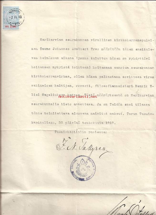 Turun tuomiokapitulin virallinen määräys vuodelta 1919.Tauno Johannes Adalbert Ervo määrätään hoitamaan Merikarvian seurakunnan kirkkoherranvirkaa heinäkuun aikana.Hänen on sovittava palkkauksestaan viran vakinaisen haltijan, rovasti Henrik Eliel Wegeliuksen kanssa.Asiakirja on päivätty Turussa 30. toukokuuta 1919.Allekirjoitus Ivar Markus Tallgren Maarian seurakunnan pitkäaikainen kirkkoherra ja moninkertainen valtiopäivämies.Turun tuomiokapitulin asessorina Tallgren toimi vuodesta 1897 vuoteen 1921 asti, minkä lisäksi hänellä oli useita luottamustehtäviä. Rovastin arvonimen hän sai vuonna 1896. Tallgren oli pappissäädyn edustaja valtiopäivillä 1888, 1891, 1894, 1897, 1899, 1904 ja 1905
