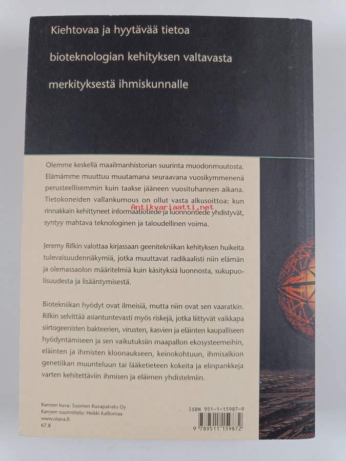 Muu(t) tekijä(t): Susanne SomersaloAlkuteos: The biotech centuryAsiasanat: biotekniikka, uhkakuvat, teknologinen kehitys, geenitekniikka