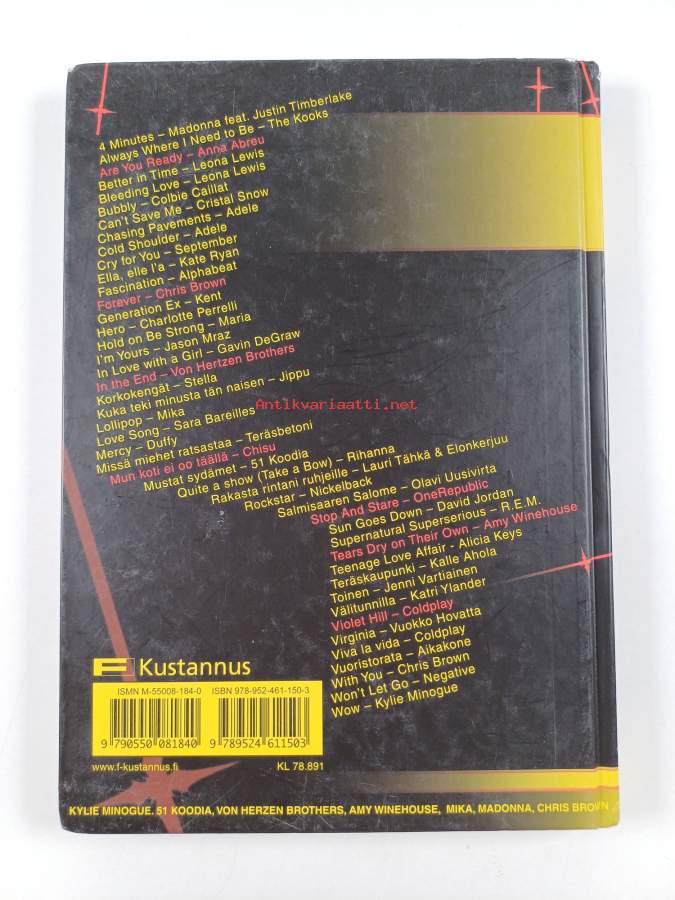 Hits 2008 hittikokoelma nuotteineen - F-Kustannus, esim. Mun koti ei oo täällä, Rakasta rintani ruhjeille