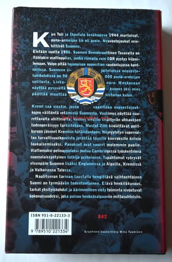 Kun Tali ja Ihantala kesäkuussa 1944 murtuivat, puna-armeijan tie oli avoin. Neuvostojoukot miehittivät Suomen. Eletään vuotta 1986. Suomen Demokraattinen Tasavalta on itäblokin mallioppilas, jonka rinnalla vain DDR pystyy kilpailemaan. Valpo pitää hajanaisen opposition raudanlujassa kontrollissa. Suomeen sijoitetuissa neuvostotukikohdissa on 90 000 puna-armeijan sotilasta. Liekanaru Moskovaan näyttää pysyvältä - kunnes yksi mies päättää muuttaa historian kulun. Kreml saa viestin, jossa vaaditaan neuvostojoukkojen välitöntä vetämistä Suomesta. Vaatimus näyttää naurettavalta uhittelulta, kunnes viestiin sisältyvän uhkauksen todenperäisyys tarkistetaan. Mustat Zilit kiidättävät politbyroon jäsenet Kremliin hätäistuntoon. Nöyryytetyn supervallan turvallisuuskoneisto jyrähtää täysille kierroksille kriisin laukaisemiseksi. Panokset ovat suuret molemmin puolin. Viattomaksi pelinappulaksi joutuu Cambridgessä työskentelevä suomalaissyntyinen tutkija perheineen. Tapahtumat vyöryvät eteenpäin Suomen lisäksi Englannissa ja Alpeilla, Kremlissä ja Valkoisessa Talossa. Naulitsevan tarinan taustalla hengittävä vaihtoehtoinen SUomi on tyrmäävän todentuntuinen. Elävä henkilökuvaus, tarkat yksityiskohdat ja äärimmilleen viety toiminta nivoutuvat kokonaisuudeksi, joka paisuu henkeäsalpaaviin mittasuhteisiin.