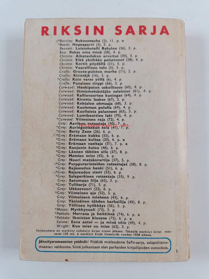 Hyvä. Tarkempi kuntoluokka: K3- ; Pientä taitejälkeä kansissa, hieman nuhruisuutta, hieman repeämää selkämyksen päissä, selkämyksessä lukutaittumaa, selkämyksessä hieman vinoutta
