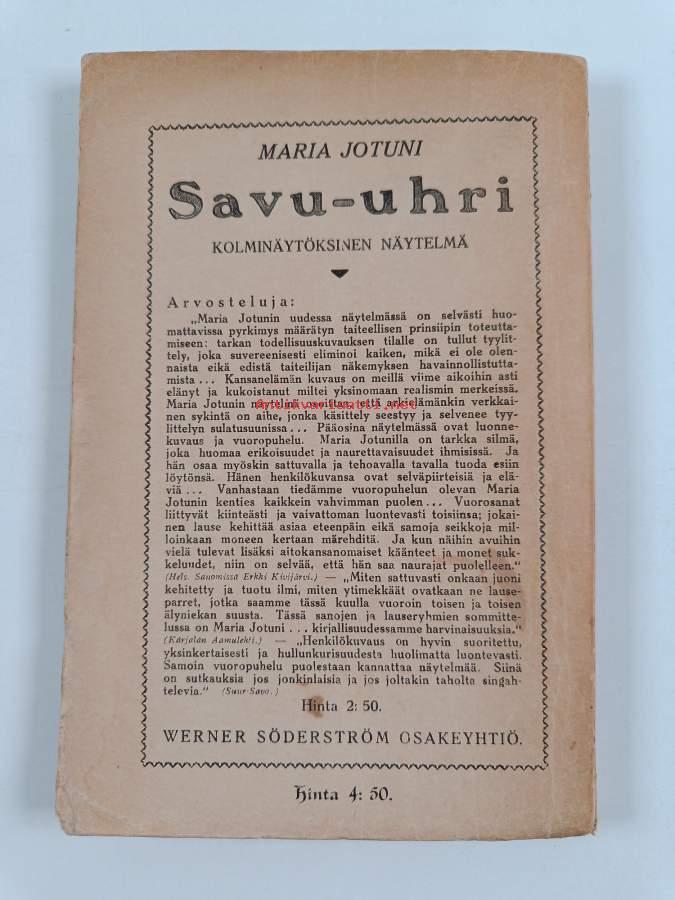 Tyydyttävä. Hieman kulumaa kansissa, pientä repeämää selkämyksessä, selkämyksessä vinoutta