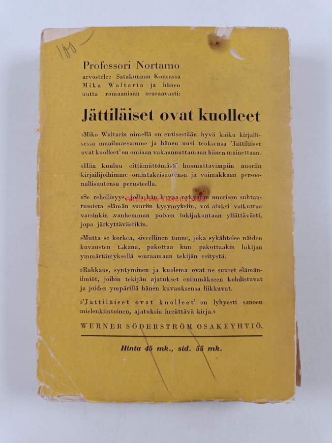 kansien reunoilta puuttuu pieniä paloja,etukansi lähes kokonaan repeytynyt irti selkämyksestä