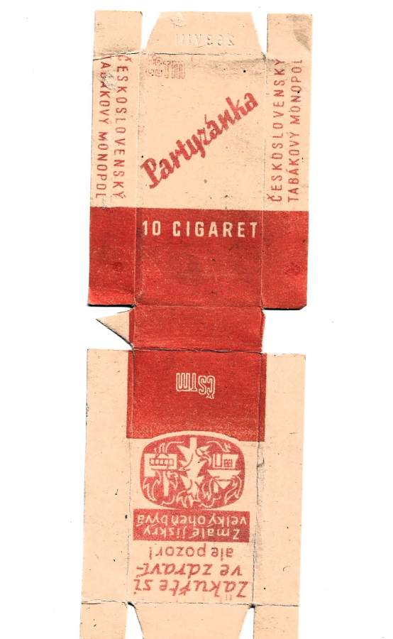 vanha tšekkoslovakialainen "Partyzánka" -merkkisten savukkeiden pakkaus, joka on peräisin Tšekkoslovakian tupakkamonopolin ajalta (ČSTM).Tuote: 10 kappaleen Partyzánka-savukerasia.Alkuperä: Tšekkoslovakia, Tupakkamonopoli.Teksti: Pakkauksessa on tšekinkielinen ympäristöteksti "VRAŤ MĚ! BUDU SUROVINOU, PRO KRABIČKU ZASE JINOU", joka kehottaa palauttamaan rasian uusiokäyttöön.KäännösVRAŤ MĚ!: Palauta minut!BUDU SUROVINOU, PRO KRABIČKU ZASE JINOU: Minusta tulee raaka-ainetta toista rasiaa varten.10 CIGARET: 10 savuketta.ČESKOSLOVENSKÝ TABÁKOVÝ MONOPOL: Tšekkoslovakian tupakkamonopoli.Partyzánka: Partisaani (tuotemerkki).