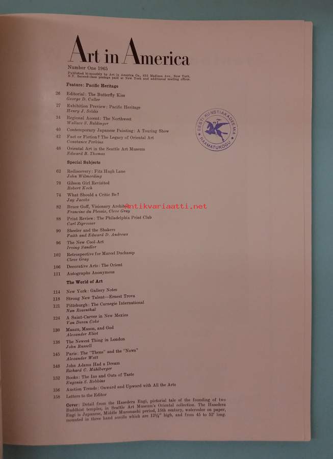 Art in America on yksi Yhdysvaltojen pitkäikäisimmistä ja vaikutusvaltaisimmista taidelehdistä, mikä perustettiin jo vuonna 1913. Lehden tarkoitus oli dokumentoida, arvioida ja edistää amerikkalaista taidetta — sekä kotimaassa että kansainvälisessä kontekstissa. Julkaisun kansikuva: japanilainen 1500‑luvun Hasedera Engi ‑kuvamaalaus (Middle Muromachi period), joka kuuluu Seattle Art Museumin orientaalisen taiteen kokoelmaan. Sisältö: numeron pääteemaan Pacific Heritage.Dimensiot 31 ¤ 23 cm.Kunto: Hieman kulumaa kansissa K3. Yksi leima: Eesti Kunstiakadeemia Raamatukogu, ei muita merkintöjä, ei repeämiä, siistit sisäsivutSisältö: Numero tarkastelee Tyynenmeren alueen kulttuuriperintöä ja sen vaikutusta amerikkalaiseen taiteeseen, sisältäen katsauksia japanilaiseen ja muuhun itäiseen taiteeseen, näyttelyihin ja alueellisiin taideilmiöihin (Northwest). Mukana on myös laaja joukko erikoisartikkeleita amerikkalaisista taiteilijoista, arkkitehtuurista, grafiikasta, kriitikon roolista, sekä kansainvälisiä taidekatsauksia New Yorkista, Pittsburghista, Lontoosta ja Pariisista. Lisäksi mukana on kirja-arvioita, huutokauppatrendejä ja museokokoelmien esittelyjä. Kokonaisuus muodostaa laajan katsauksen siihen, miten amerikkalainen taide 1965 asemoitui suhteessa Aasiaan, Eurooppaan ja omaan modernistiseen kehitykseensä.Art in America is one of the United States’ longest‑running and most influential art magazines, founded in 1913 to document, evaluate, and promote American art both nationally and internationally. The cover of this issue features a 16th‑century Japanese Hasedera Engi painting from the Middle Muromachi period, part of the Seattle Art Museum’s collection of East Asian art. The main theme of the issue is Pacific Heritage. The magazine measures 31 × 23 cm. Condition is graded K3, with light wear on the covers. There is one library stamp from the Eesti Kunstiakadeemia Raamatukogu, no other markings, no tears, and clean interior pages.The contents examine the cultural heritage of the Pacific region and its influence on American art, including surveys of Japanese and other Eastern art, exhibitions, and regional artistic developments in the American Northwest. The issue also includes a wide range of special articles on American artists, architecture, printmaking, the role of the critic, and international art perspectives from New York, Pittsburgh, London, and Paris. Additional sections cover book reviews, auction trends, and museum collections. Altogether, the issue provides a broad overview of how American art in 1965 positioned itself in relation to Asia, Europe, and its own modernist evolution.Dimensions: 31 × 23 cm.Condition: Some wear on the covers, grade K3.Markings: One library stamp from Eesti Kunstiakadeemia Raamatukogu; no other markings, no tears, clean interior pages.