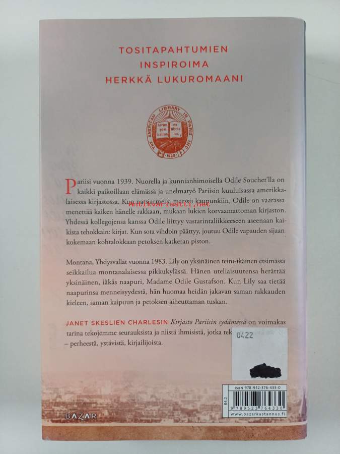 Alkuteos: The Paris LibraryAsiasanat: sota-aika, ystävyys, toinen maailmansota, Pariisi, Ranska, miehitys, kirjastot, vastarintaliikkeet, kirjastonhoitajat, Yhdysvallat, teini-ikäiset, menneisyys, salaisuudet, naapurit, aikatasot, 1980-luku, Montana