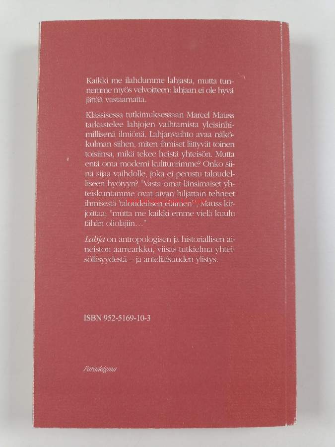 Muu(t) tekijä(t): Jouko Nurmiainen, Jyrki HakapääMerkinnät: omistajamerkintäSarja: Paradeigma; Tutkijaliiton julkaisu 94Alkuteos: Essai sur le donAsiasanat: lahjat, intiaanikulttuurit, yhteisöllisyys, kulttuuriantropologia, hindulaisuus, kulttuurisosiologia, primitiiviset kulttuurit, roomalainen oikeus