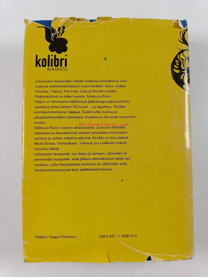 Tyydyttävä. Tarkempi kuntoluokka: K2+ ; Pientä kulumaa kansissa, hieman tahraisuutta, selkämyksessä hieman vinoutta, edessä hintalapun jäämää. Kansipaperin kunto: repeämiä/kulumaa