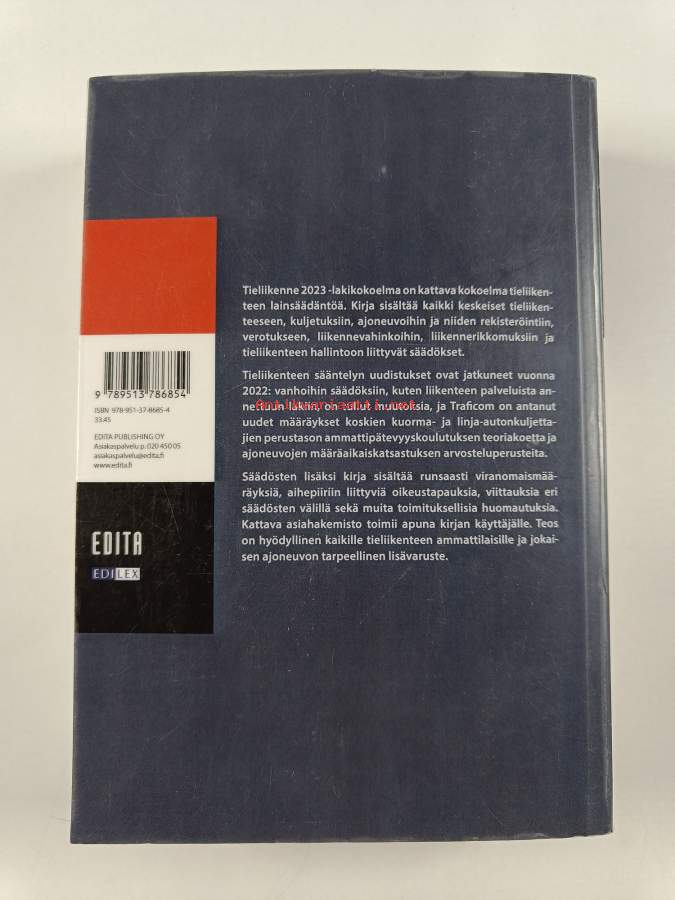 Muu(t) tekijä(t): Matti TolvanenSarja: Lakikokoelmat 2023; EdilexAsiasanat: liikennesäännöt, liikennemerkit, lainsäädäntö, verotus, liikenne, ajoneuvot, tieliikenne, hallinto, tiekuljetus, liikennerikkomukset, liikennevahingot, liikennerikokset, tieliikennelaki