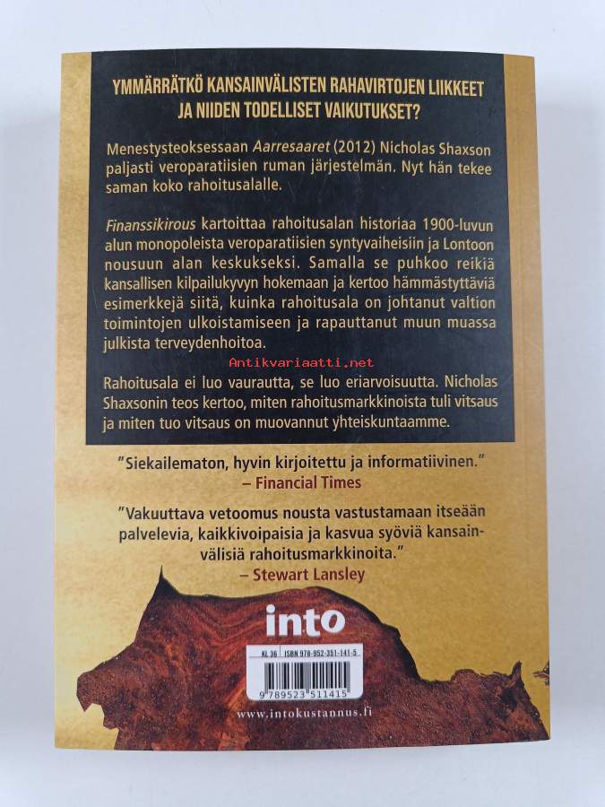 Muu(t) tekijä(t): Mari Janatuinen, Laura KalmukoskiAlkuteos: The finance curseAsiasanat: historia, taloushistoria, pankit, rahoitusmarkkinat, rahoitusala, finanssiala, taloudelliset kriisit, kansainvälinen talous, pääoma, veronkierto, veroparatiisit, monopolit, sijoitusyhtiöt