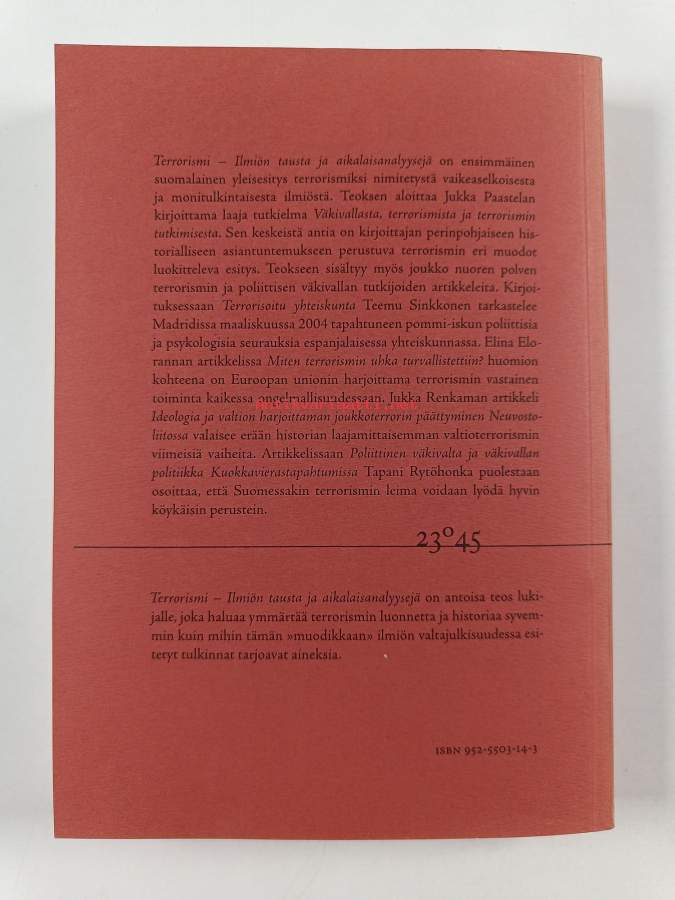 Muu(t) tekijä(t): Jukka PaastelaSarja: 23°45 Eurooppalaisen filosofian seura ryAsiasanat: terrorismi, turvallisuus, poliittinen väkivalta, terrori-iskut, terrorisminvastainen toiminta, mielenosoitukset