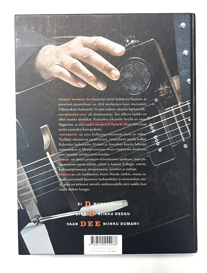 Tuomari Nurmion 30-vuotinen ura on ollut vankkaa nousuvoittoista alamäkeä: ensimmäinen levy myi parhaiten ja on menestynyt parhaiten myös kriitikkoäänestyksissä. Yhden miehen sota on ollut poukkoileva kuin Odysseuksen - tai tuulivoimaloita tarkastelevan Don Quijoten - muinainen harharetki. Kuitenkin jokaisella levyllä on omat diggarinsa, ja aina uudet sukupolvet löytävät jotain kiintoisaa tuolta tunteiden kaatopaikalta.Tuntematon on aina kiehtonut Nurmiota enemmän kuin jo nähty. Hän sekoittaa tyylilajeja suruttomasti, virtuaalinen matka kulkee Kalevalan laulumailta Afrikan ja Amerikan kautta Saharan autiomaahan ja Mesopotamiaan, mutta lopputulos kuulostaa aina itsestään selvästi suomalaiselta. Ura Tuomarina on ollut taistelua ja leikkiä, kyseenalaistamista, etsimistä ja onneksi myös löytämistä. Jokin synteesi tuntuu löytyvän kaiken takaa.Dumari on tämän prosessin moniääninen ajankuva, jossa puheenvuoron saavat niin tekijät kuin kokijat, kollegat, ystävät, kulttuuripersoonat, kriitikot ja tutkijat. Näkökulma on stadilainen, kuten Nurmio itsekin, mutta opus on samalla universaali kertomus lauluntekijän ja soittoniekan tiestä, joka jatkuu samalla väsymättömällä libidoenergialla kuin 30 vuotta sitten.