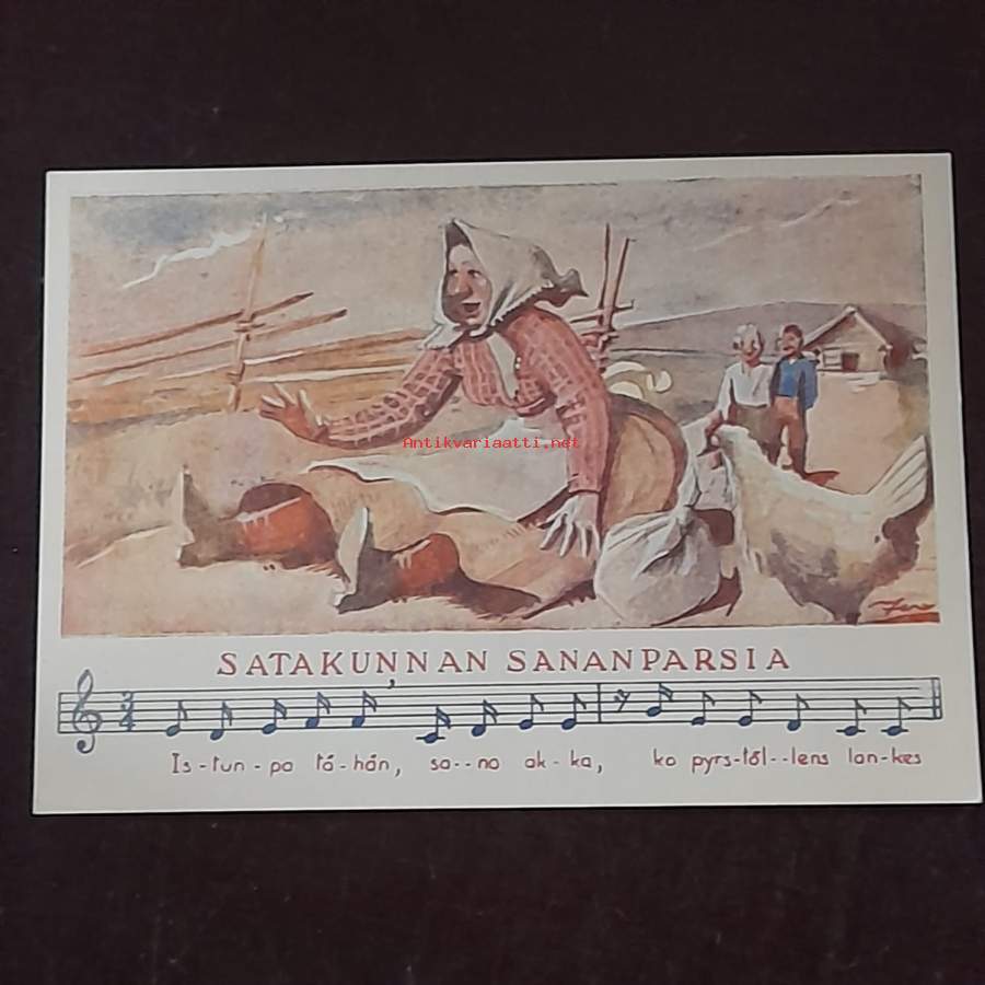 Postikortti: Satakuntalaisia sananparsia. Kortin piirtänyt Eeli Jaatinen. Kulkematon.