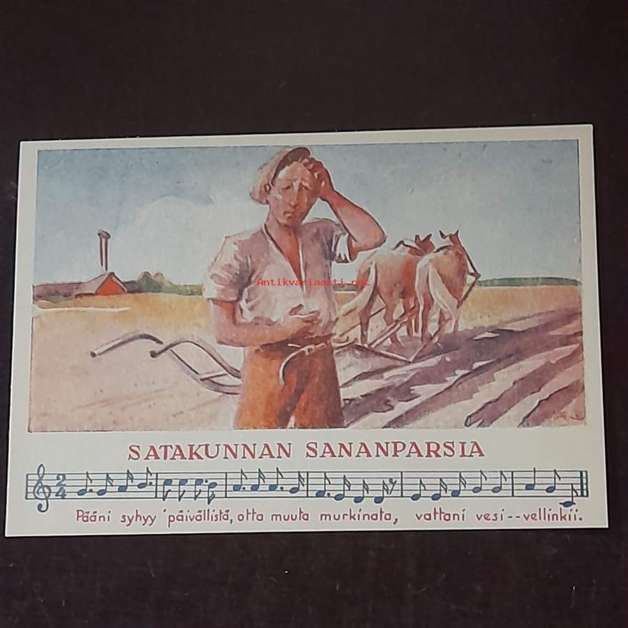 Postikortti: Satakuntalaisia sananparsia. Kortin piirtänyt Eeli Jaatinen. Kulkematon.
