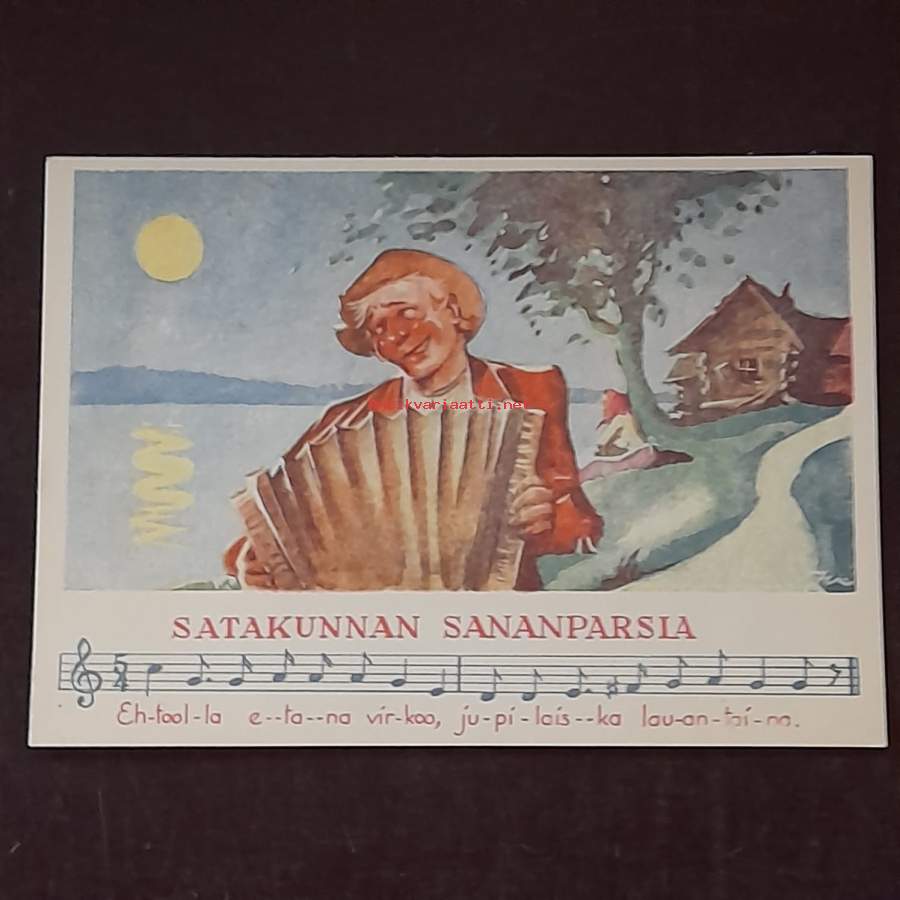 Postikortti: Satakuntalaisia sananparsia. Kortin piirtänyt Eeli Jaatinen. Kulkematon.